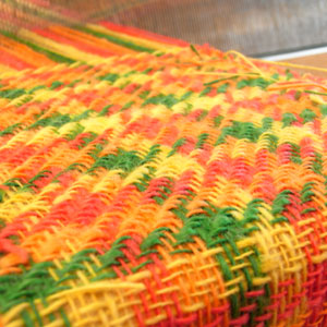 前回の四色襟巻きの残り糸を使ってランダムな格子柄の織り始めました。